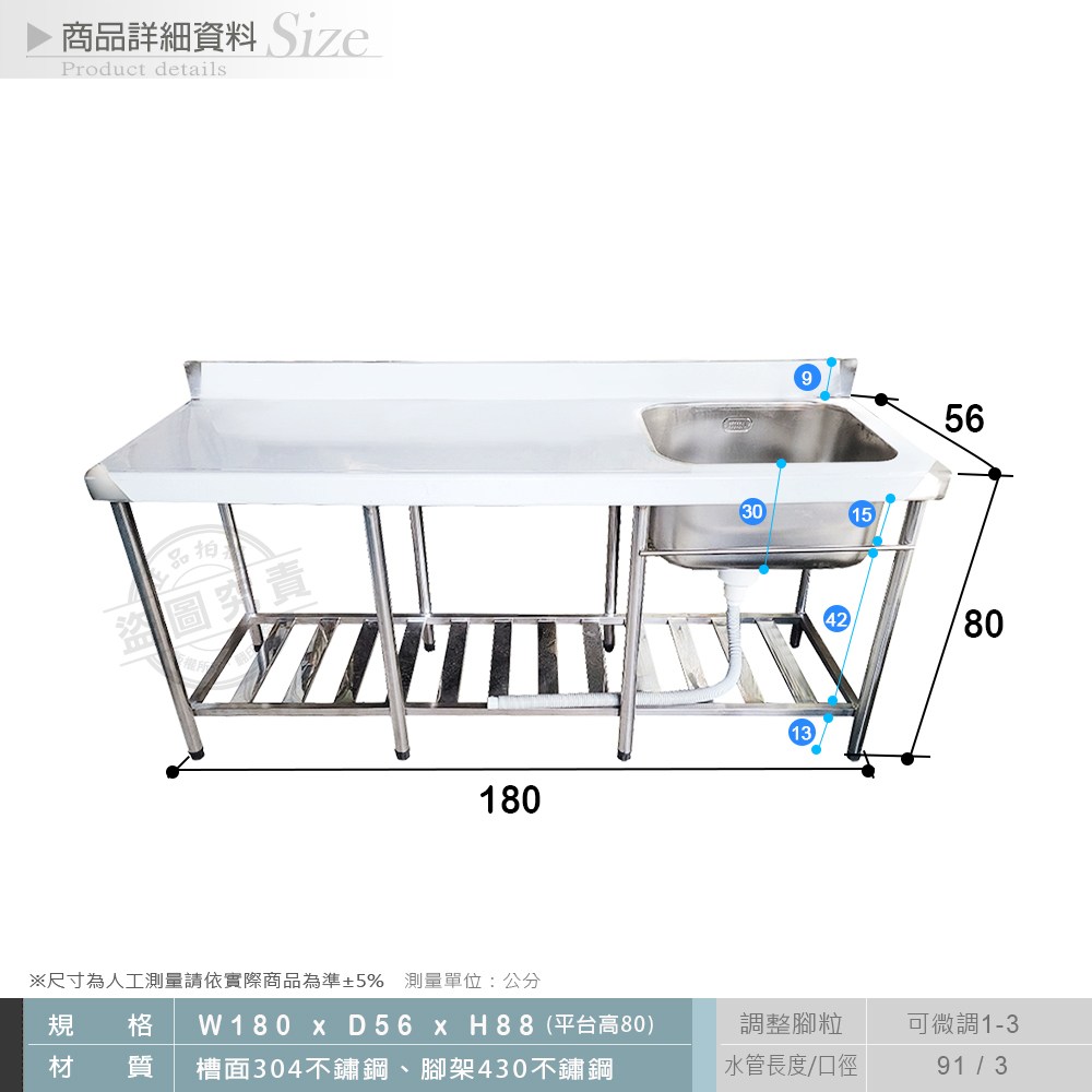 【Abis】客製商品-頂級升級加牆款304不鏽鋼180CM單洗台+平台水槽/洗手台/洗碗槽/洗衣槽/流理台(6尺)-中槽