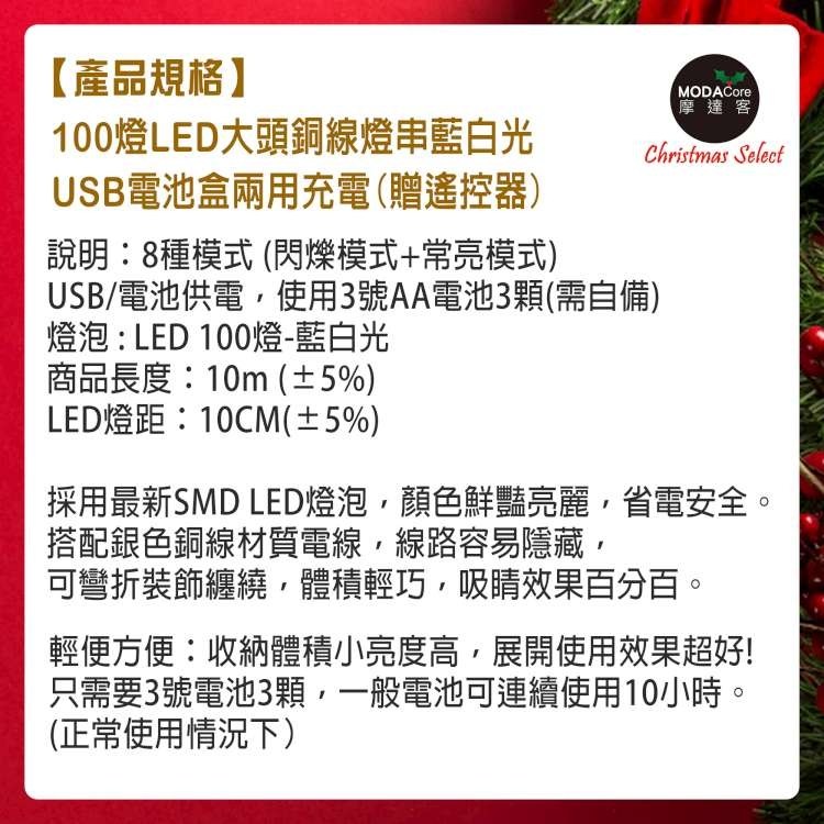 點我下載摩達客-100燈LED大頭銅線燈串藍白光-USB電池盒兩用充電(贈遙控器)浪漫星星燈聖誕燈