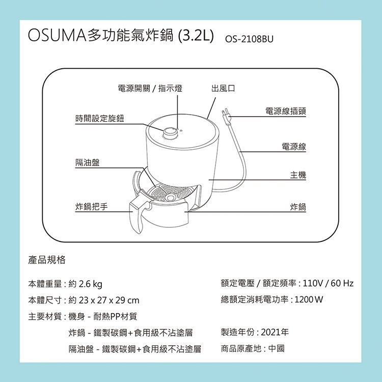 OSUMA 3.2L多功能氣炸鍋 OS-2108BU