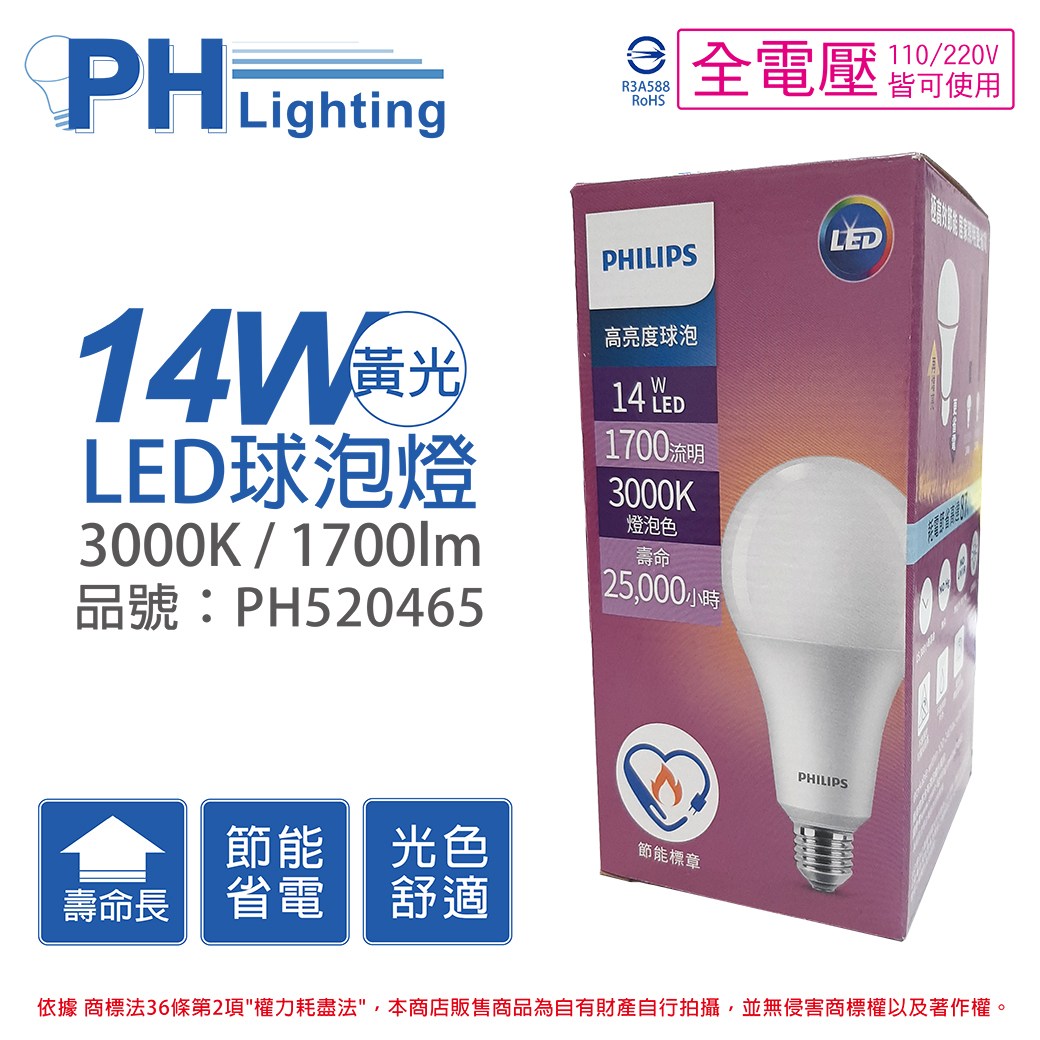 PHILIPS 飛利浦 LED易省球泡燈 12W 黃光 3000K 1個