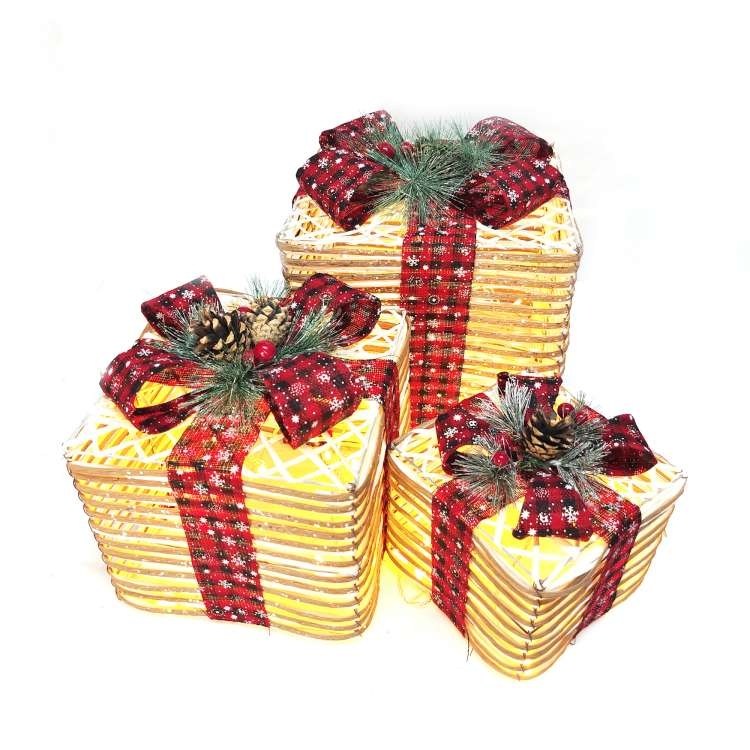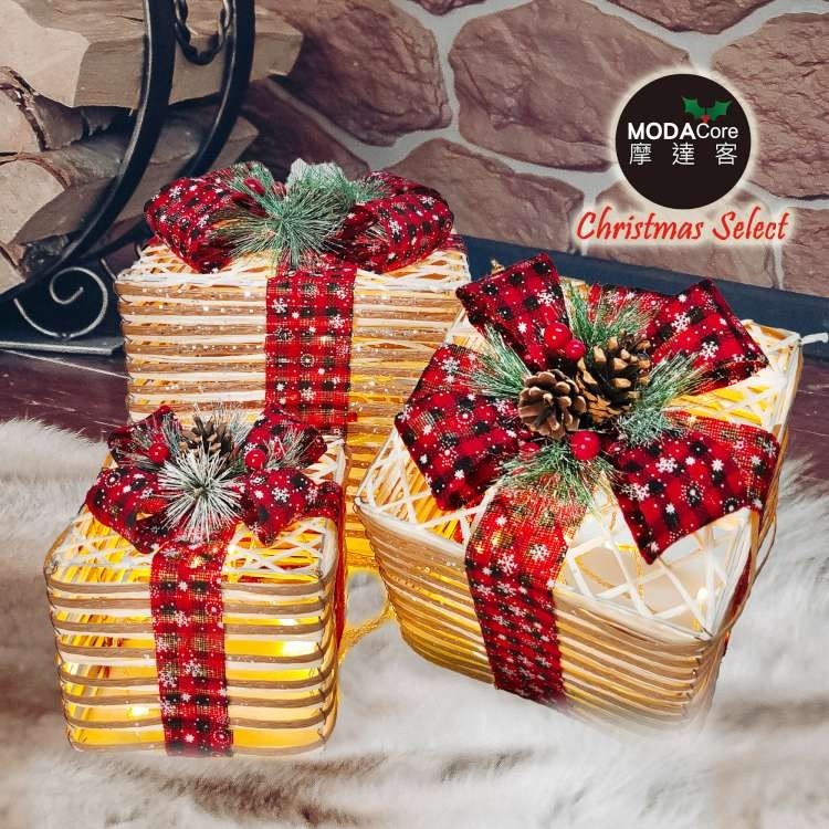 摩達客 聖誕發光麻紙繩裝飾禮物盒套組擺飾 大中小3入 + LED燈 26 x 26 x 30cm + 21 x 21 x 25cm + 16 x 16 x 18cm 1組