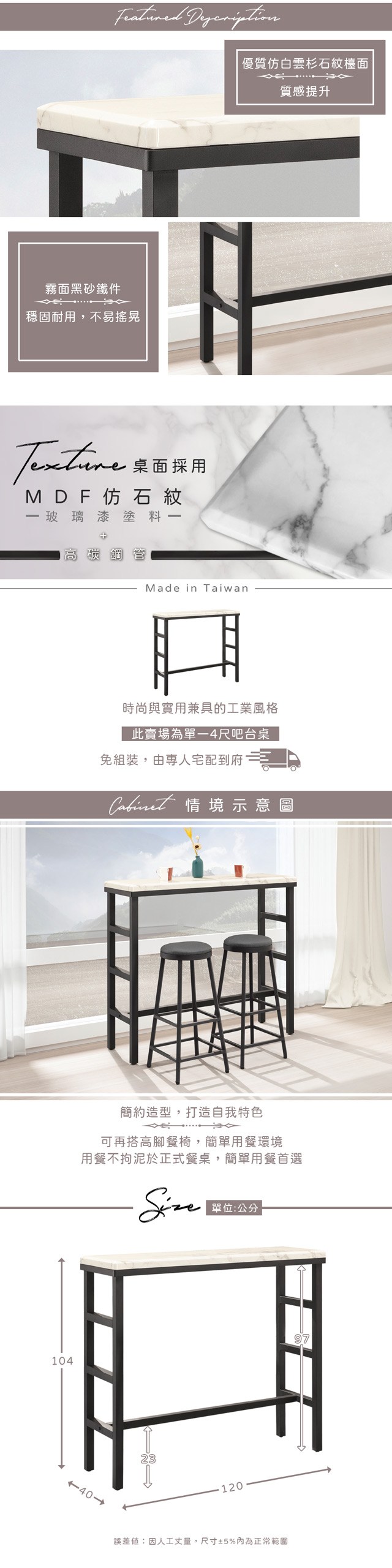 Boden-歐維克4尺工業風仿石面吧台桌/吧檯桌/高腳桌/休閒桌/洽談桌-120x40x104cm