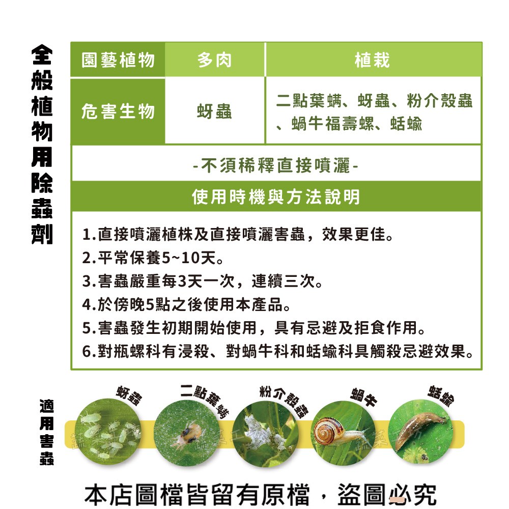5.害蟲發生初期開始使用,具有忌避及拒食作用。