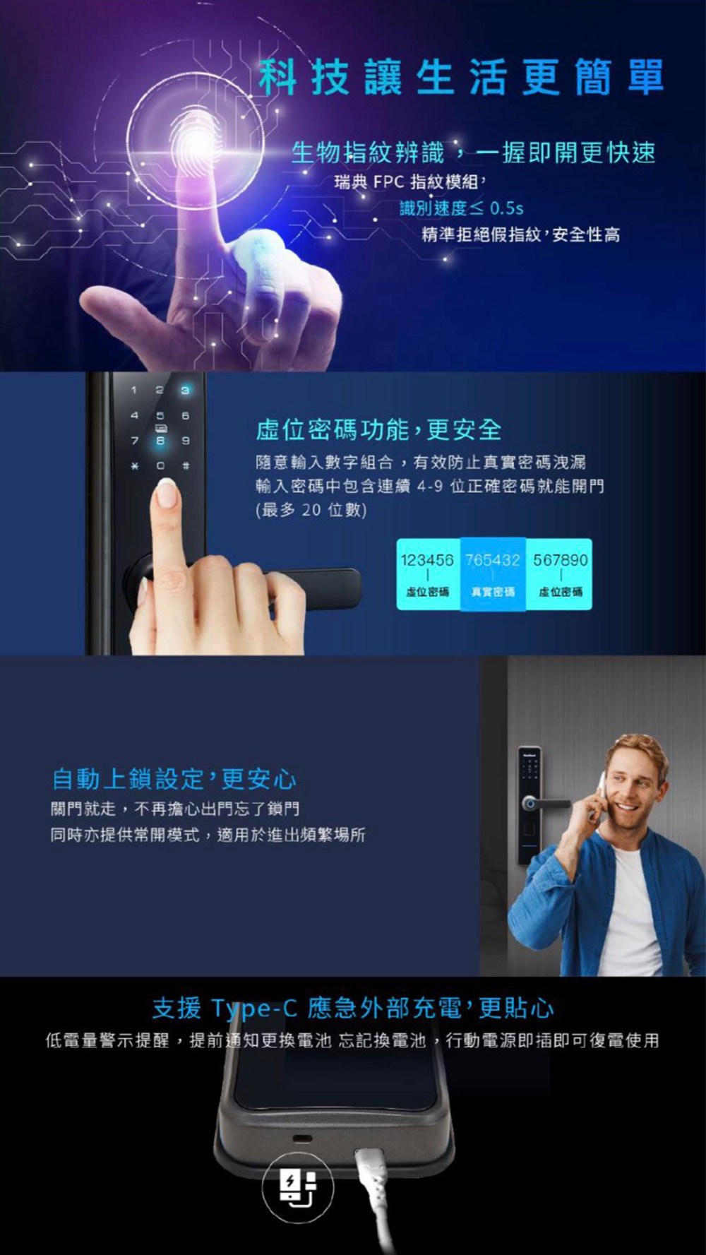 TEW 台熱牌 智能5合1把手式電子鎖/門鎖(H1)(指紋/密碼/卡片/鑰匙/APP遠端開門)(附基本安裝)