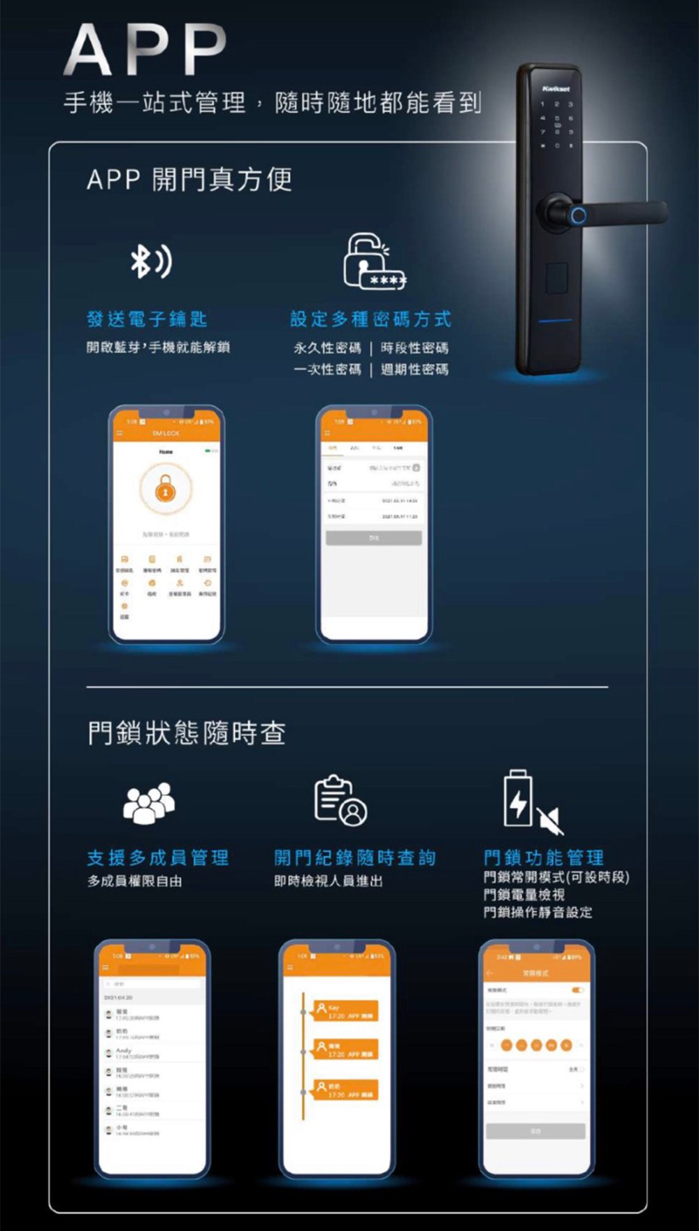 - 手機APP控制新增/刪除設定並可發送電子鑰匙
