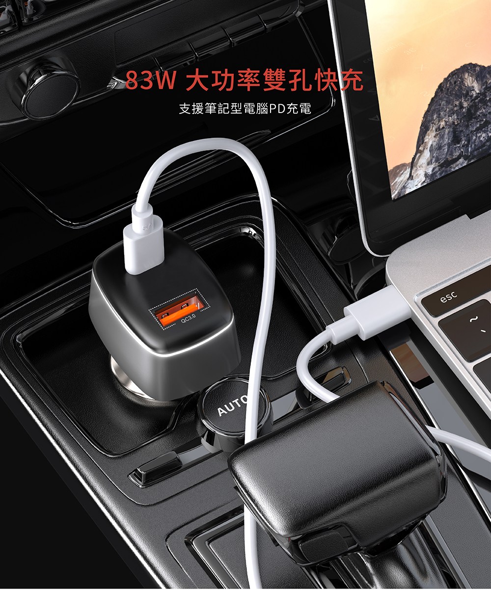 Wildex微透 63W急速充電 PD+QC雙孔電瓶電壓車充頭+PD20W Type-C to Lightning 傳輸充電線(100cm)
