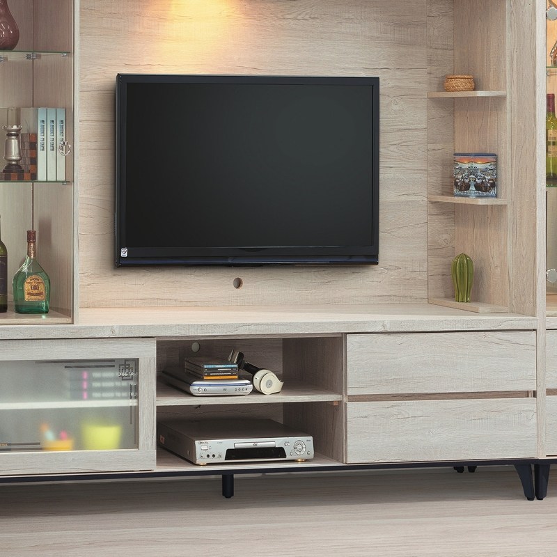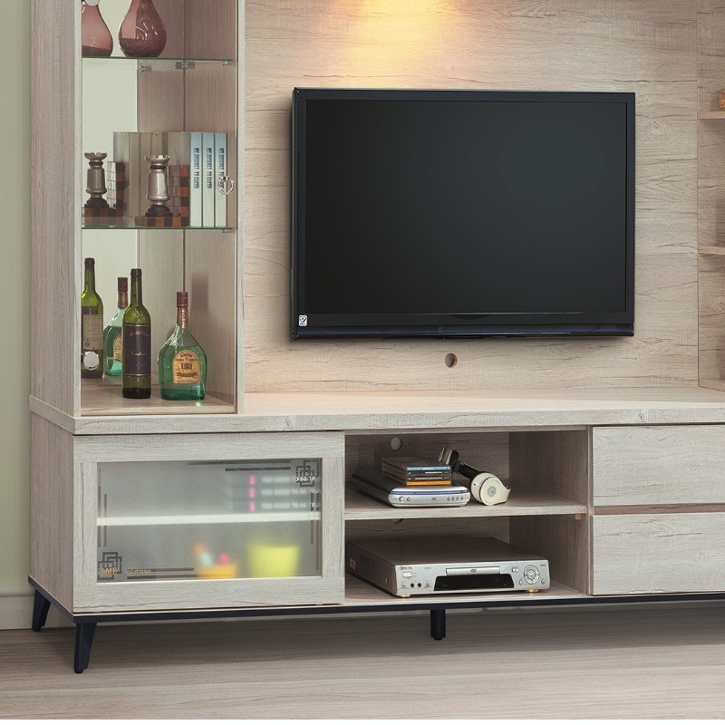 電視櫃門片左右滑動。附兩抽屜。