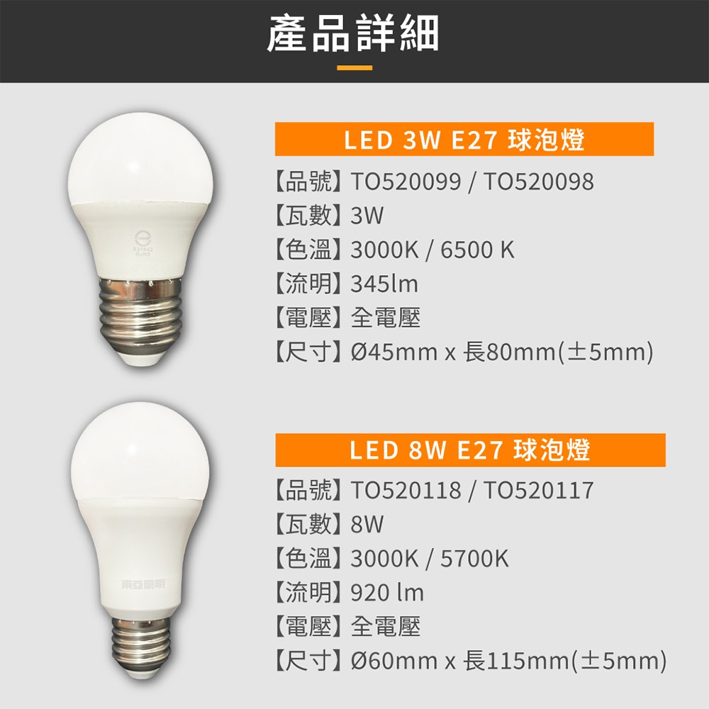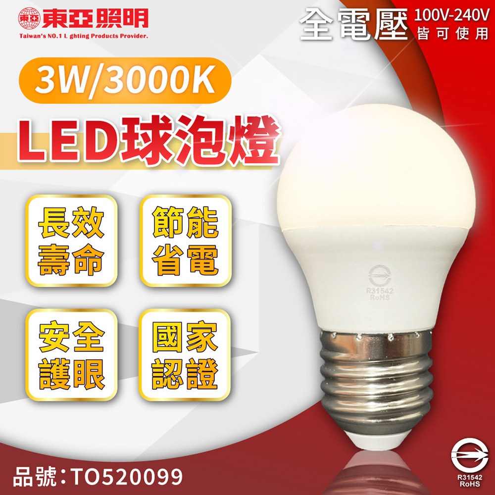 東亞照明 LLA017-3AALH 3W 3000K 燈泡色 E27 全電壓 LED 球泡燈 節能省電 1個