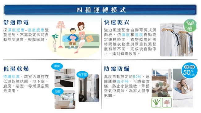 *四種運轉模式:舒適節電/快速乾衣/低濕乾燥/防霉防蟎