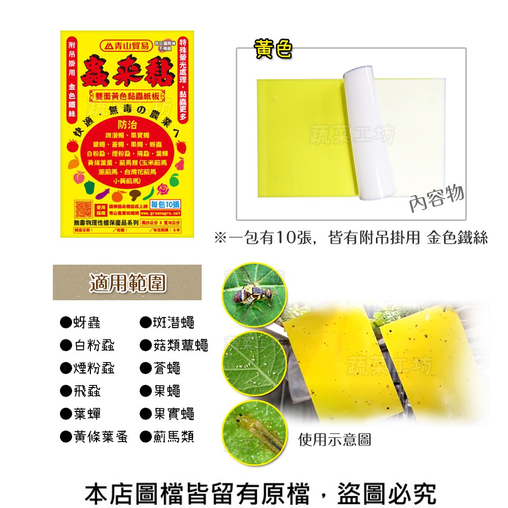 利用會被顏色引誘的習性防治法,且可改變黏著資材的放置方式(吊掛),誘引蚜蟲、果蠅、昆蟲(如瓜果實蠅、家蠅等各種昆蟲)使蟲體黏在黏膠上自然死亡。