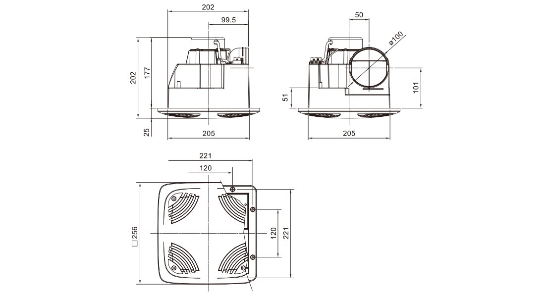 | 使用電源 | 出風口尺寸 | 轉速 | 消耗功率 (W) | 最大排風量 (m3/h) | 噪音值 (dBA) | 最大靜壓 (mmAq) | 重量 (kg) | 安裝尺寸 (mm) |