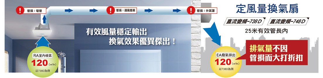 | 絕對有感的換氣升級解決方案! 風量遞減,效果有限 定額輸出,舒適加倍 『定風量』設計可確保於有效管長內,過長管路或是彎管過多所造成排氣不足的現象,依然維持額定輸出排風量,順暢排出濕氣與異味。 國內第一台定風量DC直流變頻換氣扇,有別於一般換氣扇其風量會隨管損遞減,而以738D為例,配管25米之管損內,機器皆能維持額定輸出風量,換氣效果大提升! | 換氣不良的浴廁![]() |