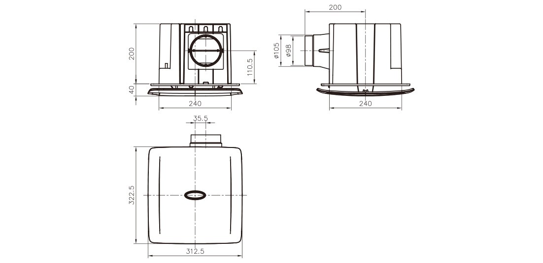 | 轉速 | 消耗功率 (W) | 風量 (m3/h) | 噪音值 (dBA) | 有效換氣量(m3/h) | 定風量域最大靜壓 (mmAq) | 重量 (kg) | 出風口尺寸 (mm) | 安裝尺寸 (mm) | |