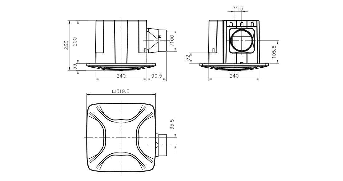 | 使用電源 | 出風口尺寸 | 消耗功率 (W) | 重量 (kg) | 扇葉 (cm) | 最大排風量 (m3/h) | 最大靜壓 (mmAq) | 噪音值 (dBA) | 安裝尺寸 (mm) |