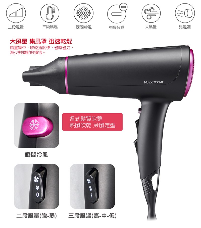 - 大風量、二段風量、三段風溫、瞬間冷風,沙龍專業級吹整。
