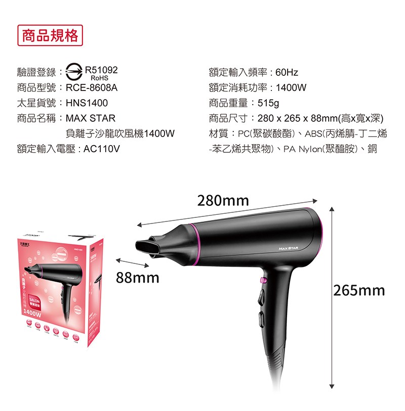 太星電工 MAX STAR 負離子沙龍吹風機 1400WHNS1400