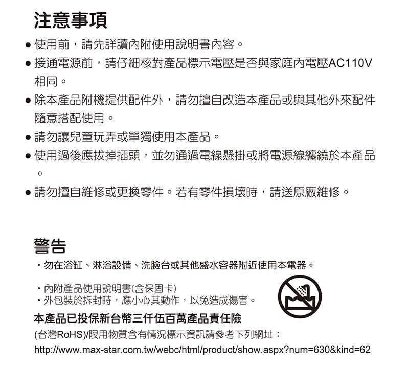 - 本產品已投保新台幣三仟伍佰萬產品責任。