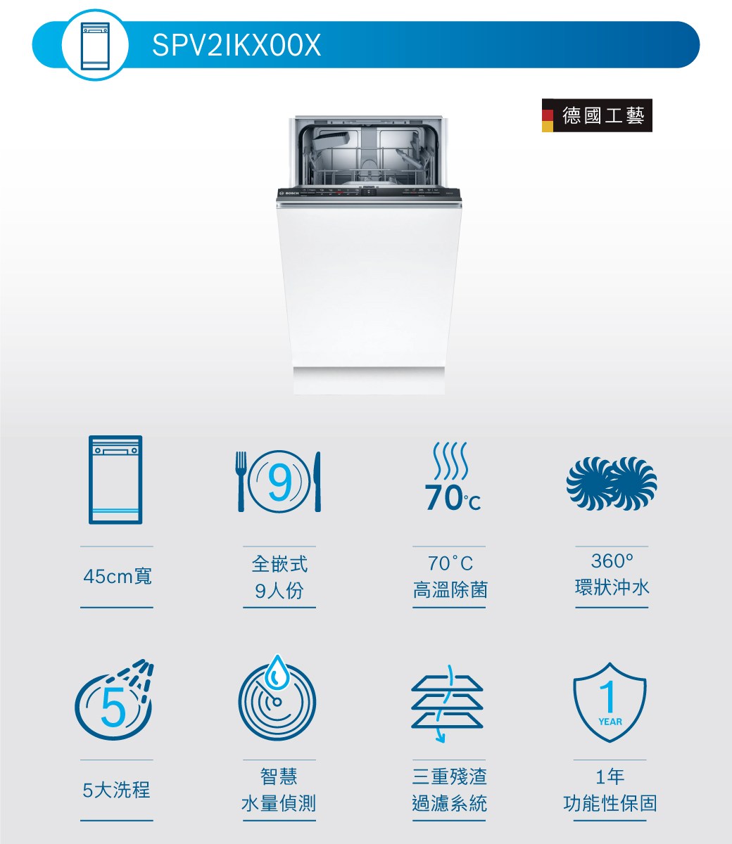 BOSCH 45cm 10人份全嵌式洗碗機 高溫殺菌/智慧水量偵測 SPV4IMX00X