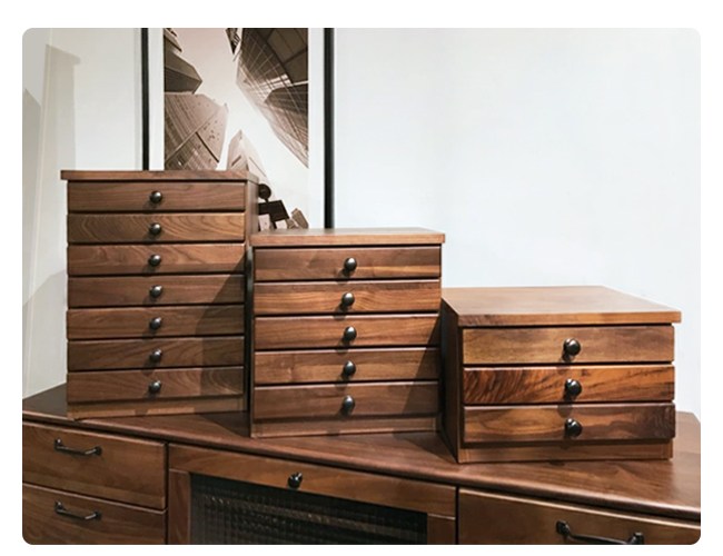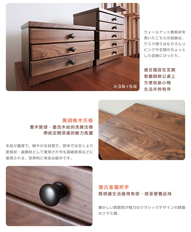 名列世界屈指可數的銘木黑胡桃木,擁有獨一無二的質感「墨流木紋」,沈穩的色調醞釀出高貴不凡的厚實感,質地硬沉,經久使用。實木質感的天板,帶給空間深邃的魅力氛圍。復古金屬把手,質感讓生活變得有感,感受懷舊品味。A4 文件抽屜,重要的契約與文件,有著相稱的收藏櫃,並有檔板防落設計,防止全開抽屜時滑落。