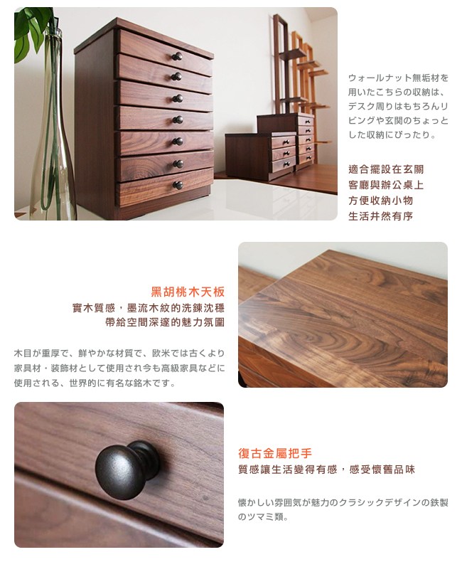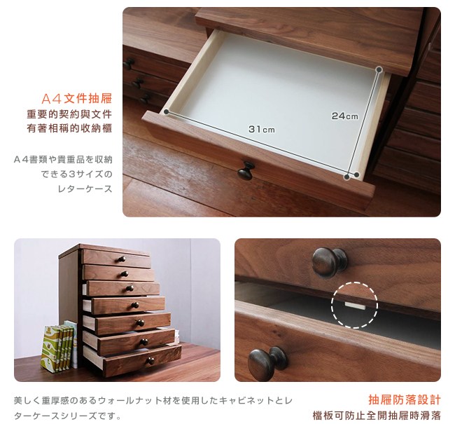名列世界屈指可數的銘木黑胡桃木,擁有獨一無二的質感「墨流木紋」,沈穩的色調醞釀出高貴不凡的厚實感,質地硬沉,經久使用。實木質感的天板,帶給空間深邃的魅力氛圍。復古金屬把手,質感讓生活變得有感,感受懷舊品味。A4 文件抽屜,重要的契約與文件,有著相稱的收藏櫃,並有檔板防落設計,防止全開抽屜時滑落。