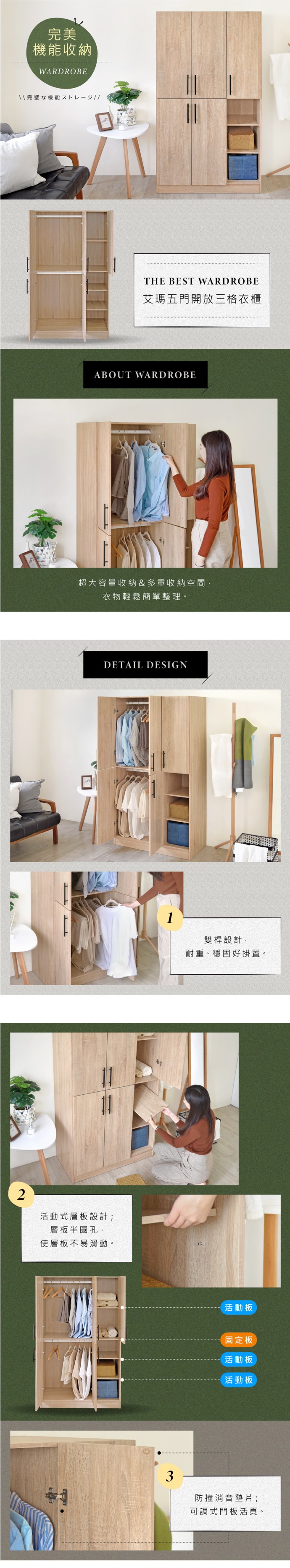《HOPMA》德國海福樂鉸鏈 嵌入式美背極緻二門五格衣櫃 台灣製造 衣櫥 收納櫃 衣物收納櫃-淺橡(漂流)木