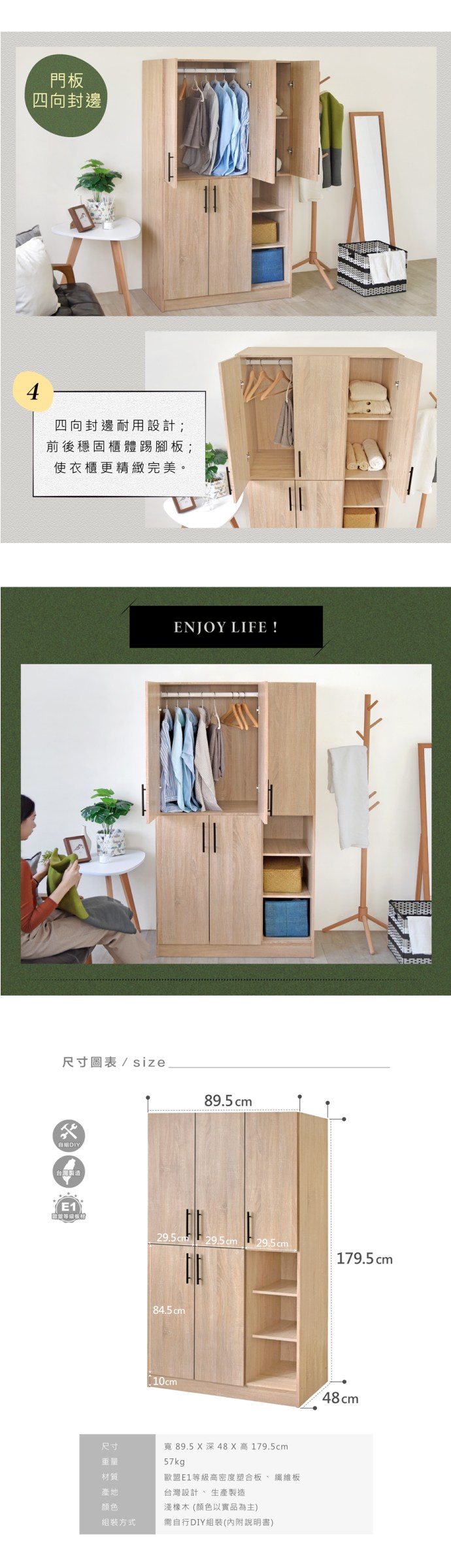 林氏木業北歐簡約四門雙抽衣櫃 MJ8D-原木色 (附頂櫃) (H014342664)