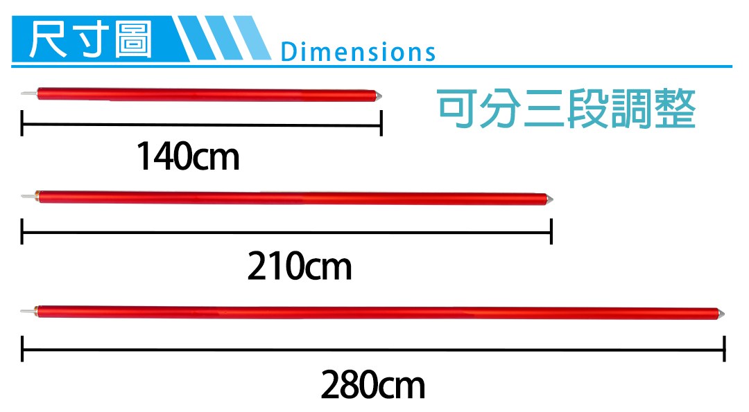 ◆ 四截式伸縮營柱長140~280cm,可依所需三段調整高度。