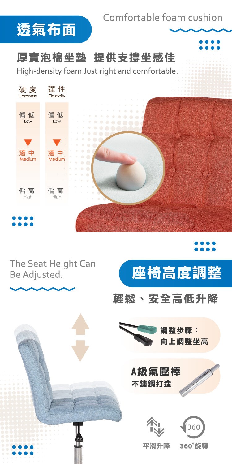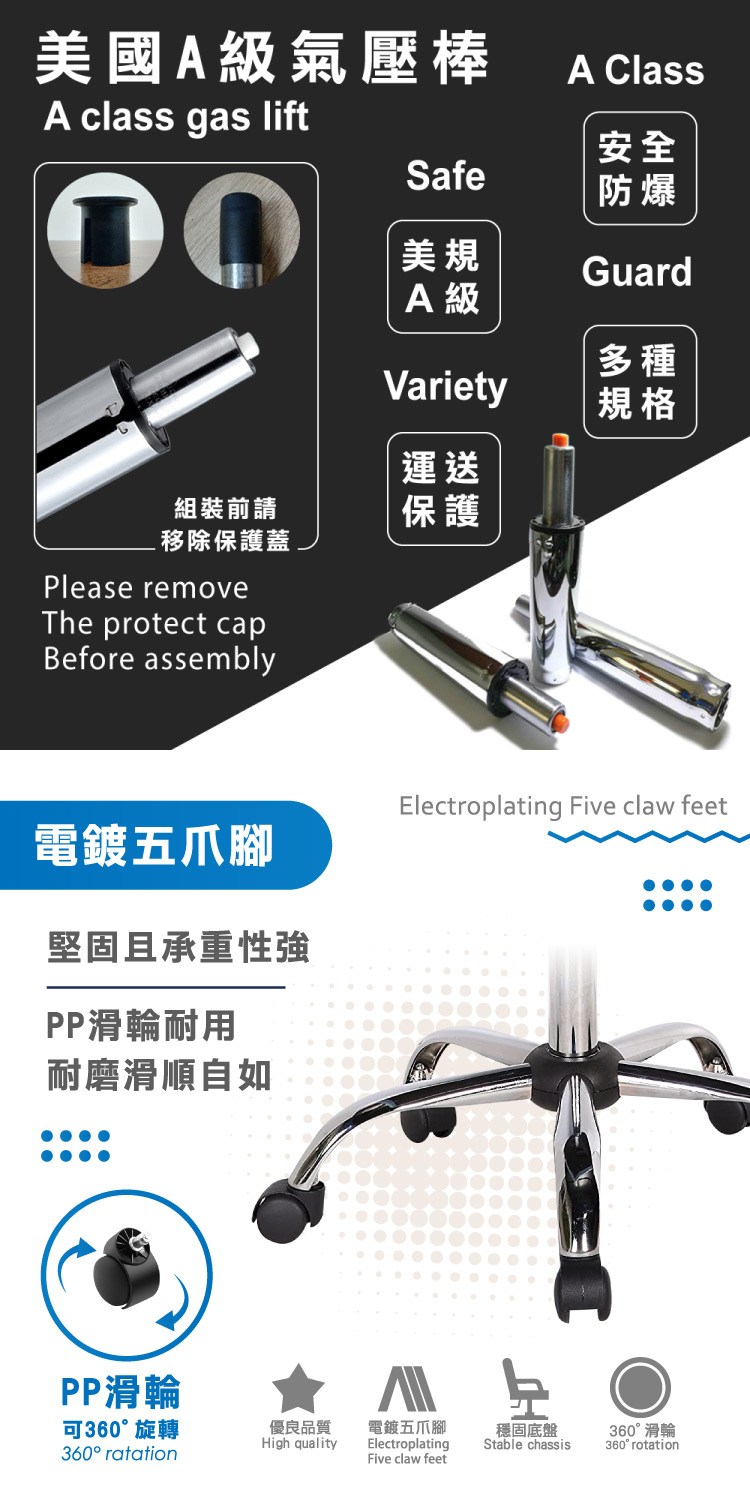 配合美規A級氣壓棒、安全升降,採電鍍五爪腳,堅固且承重性佳,360°旋轉P.P.滑輪、靈活且耐磨,