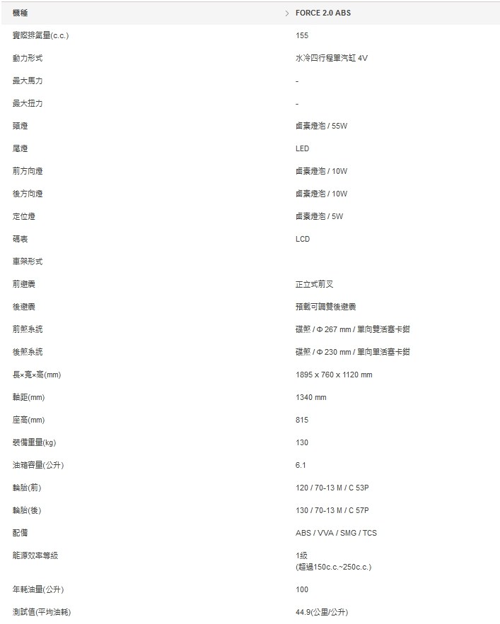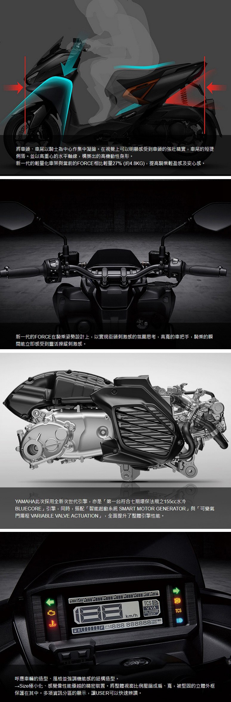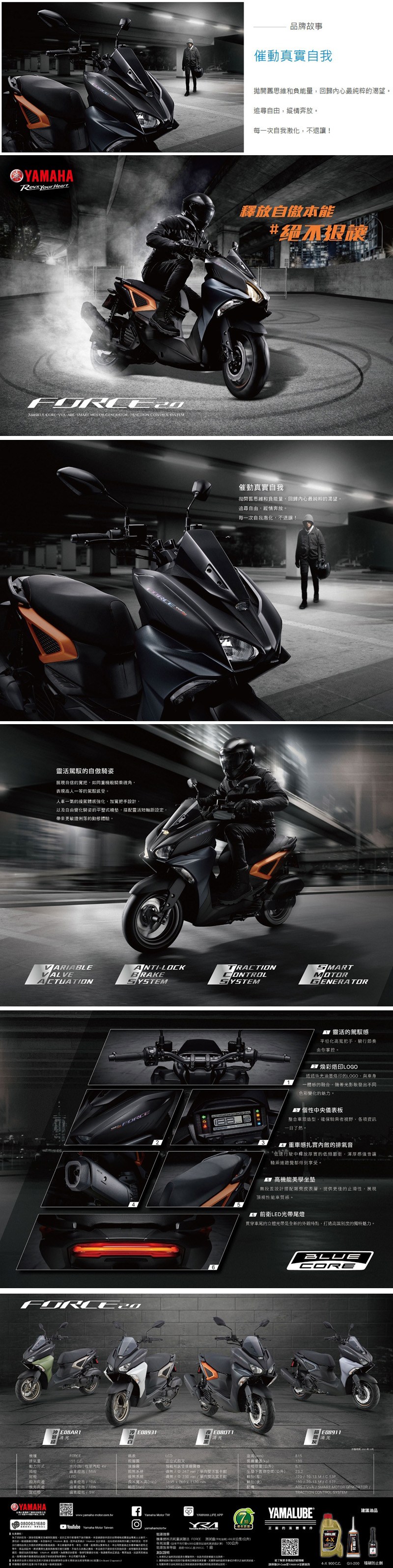加碼送 丟車賠車保障一年FORCE於2016年上市以來,以「霸氣」、「衝擊」元素展現為街頭而生的形象,受到喜愛操駕車友們的青睞,在加速、穩定性、過彎…等的表現皆優於同級車款,成為Yamaha熱銷車款之一。