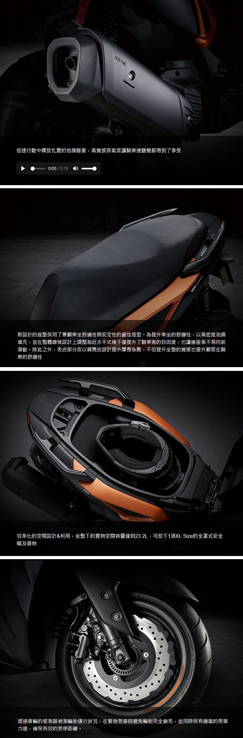 同時為了增加騎乘時的聽覺享受,透過調整排氣尾管徑,讓「FORCE 2.0」 在低速行駛時可創造出「渾厚低沉的引擎輸出聲浪」。 -