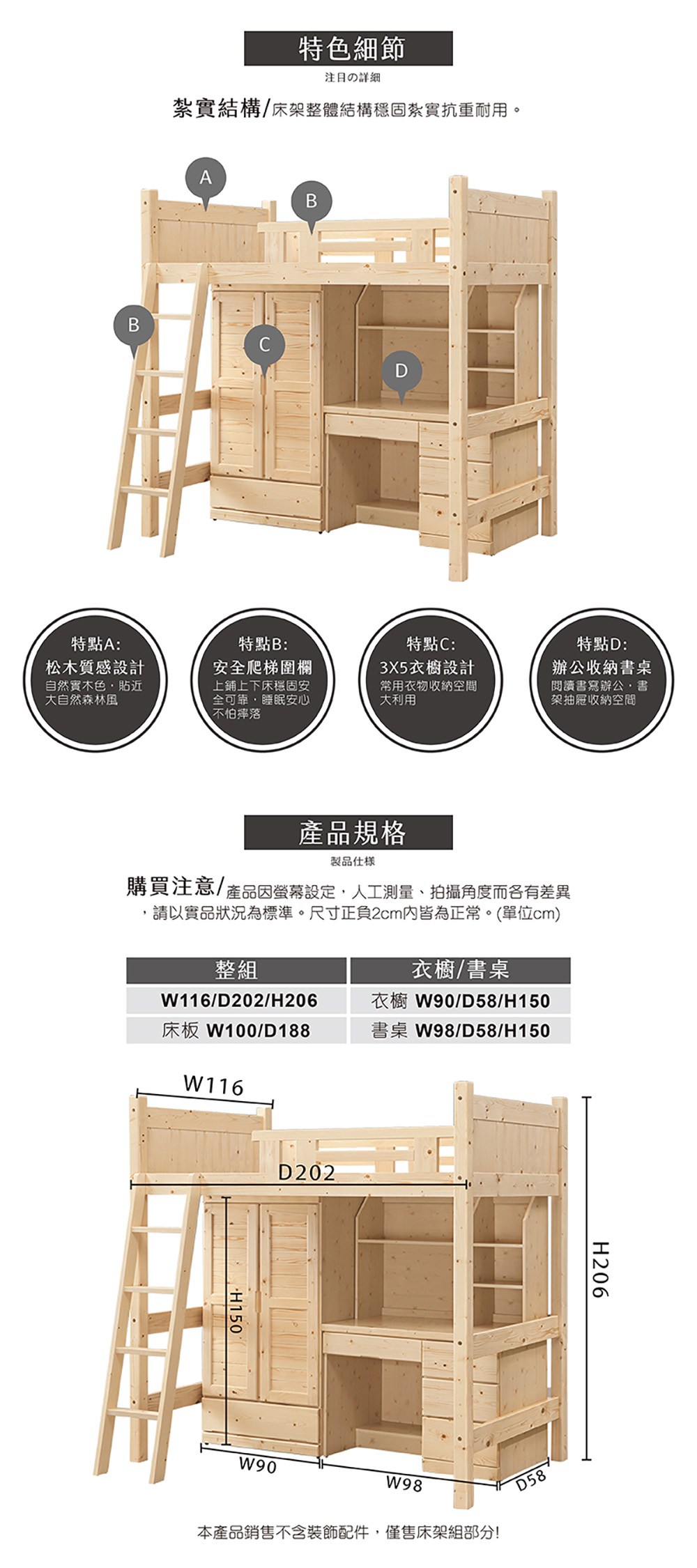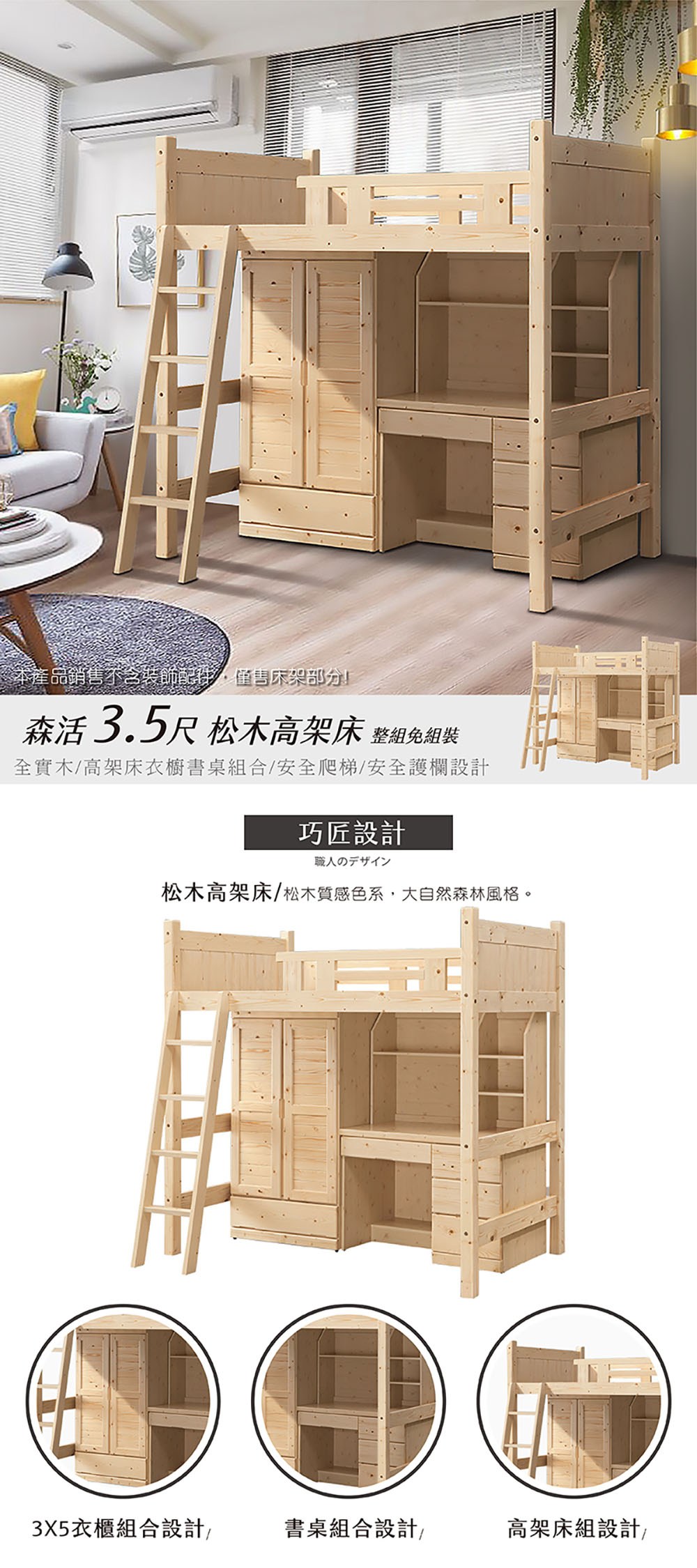 【MUNA】 松木3.5尺高架床(含衣櫃書桌)