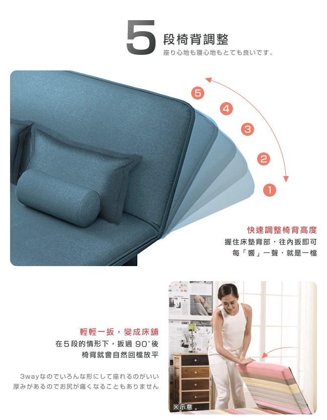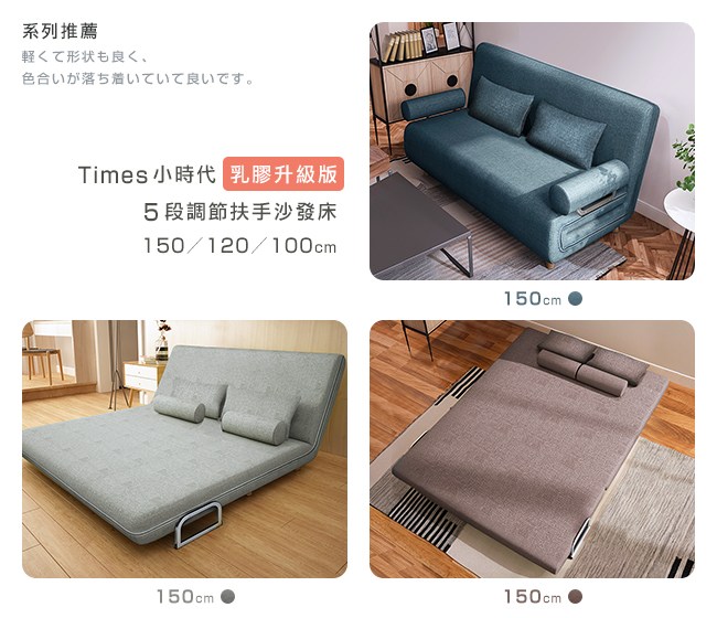 白天是沙發,夜晚搖身一變成為了床舖。空間雖然有限,卻框不著無限創意的您。點亮小空間的佈置,沙發床能夠放在客廳、臥室、書房,不佔用空間,非常適合小格局住宅使用。3WAY Sofa&Bed,三種用途:「沙發」不會帶來空間擁擠感,即使是小部屋也能感受到寬敞;「躺椅」輕鬆閱讀、使用筆電、平板,享受舒適生活的步調。「床舖」剛好的睡眠空間,作為客床也方便。【C'est Chic】Times小時代(乳膠升級版)5段沙發床-幅150,小坪數也能節省大空間,一個小小的改變,帶給生活一份幸福感。