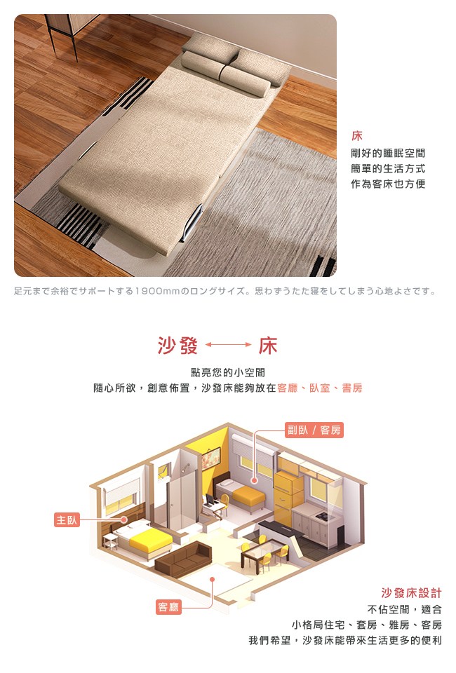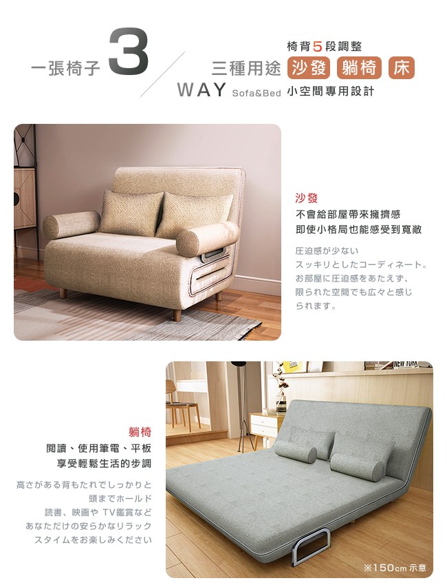 白天是沙發,夜晚搖身一變成為了床舖。空間雖然有限,卻框不著無限創意的您。點亮小空間的佈置,沙發床能夠放在客廳、臥室、書房,不佔用空間,非常適合小格局住宅使用。3WAY Sofa&Bed,三種用途:「沙發」不會帶來空間擁擠感,即使是小部屋也能感受到寬敞;「躺椅」輕鬆閱讀、使用筆電、平板,享受舒適生活的步調。「床舖」剛好的睡眠空間,作為客床也方便。【C'est Chic】Times小時代(乳膠升級版)5段沙發床-幅100,小坪數也能節省大空間,一個小小的改變,帶給生活一份幸福感。