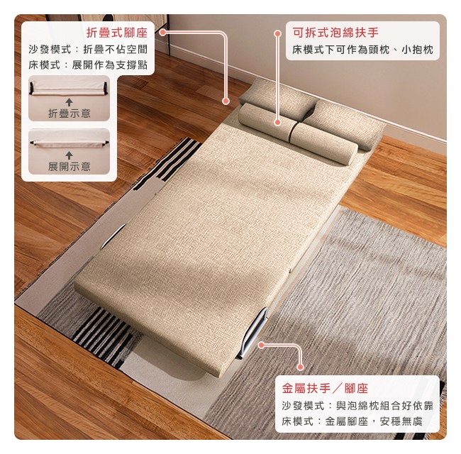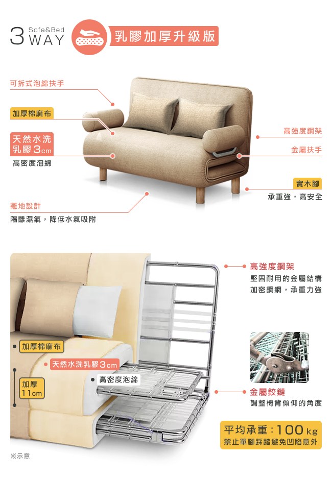 New Plus加厚升級:天然水洗乳膠 3cm,柔軟彈性帶來良好的包覆性,服貼全身,均勻分散體壓,久睡舒適。氣孔結構,透氣不悶熱,睡感更舒服。不易凹陷變形,經久使用。加厚棉麻布,透氣、親膚性好,不易過敏。特別加厚的布料,觸感更加細膩,並提升強度與耐磨性。五段椅背快速調整,握住床墊背部,往內扳即可選擇椅背傾仰度。椅背扳過 90 度後,自然回檔放平,簡單變成一張床舖。高強度鋼架,堅固耐用的金屬結構。實木腳承重強,安全無虞。防刮腳墊避免刮傷木質、磁磚地板。離地設計方便打掃。可拆洗布套,定期清潔床套,避免過敏原孳生。