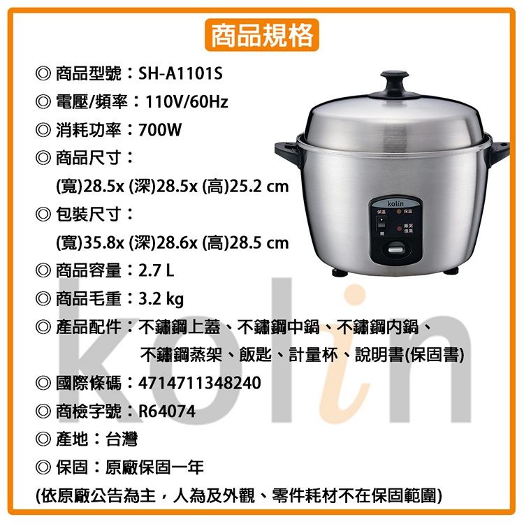 Kolin歌林 11人份2.7公升3級能效不鏽鋼養生電鍋 SH-A1101S