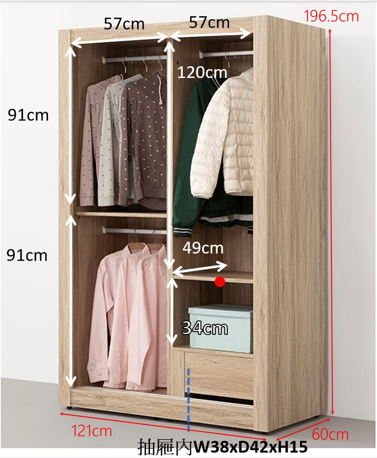 4X7尺衣櫥 寬 121 X 深 60 X 高 196.5 公分