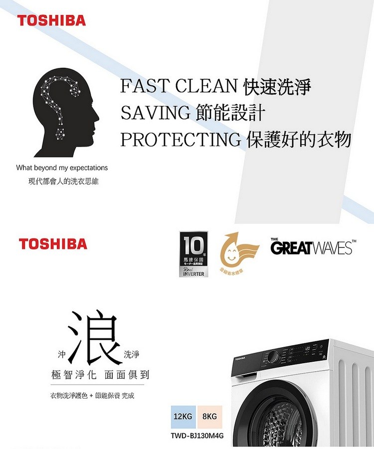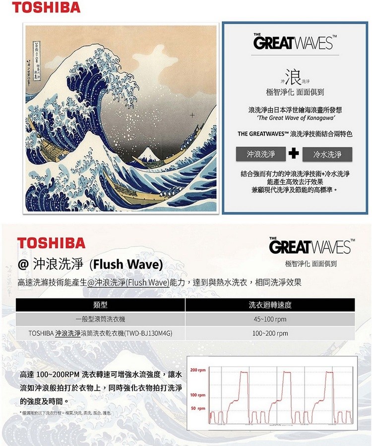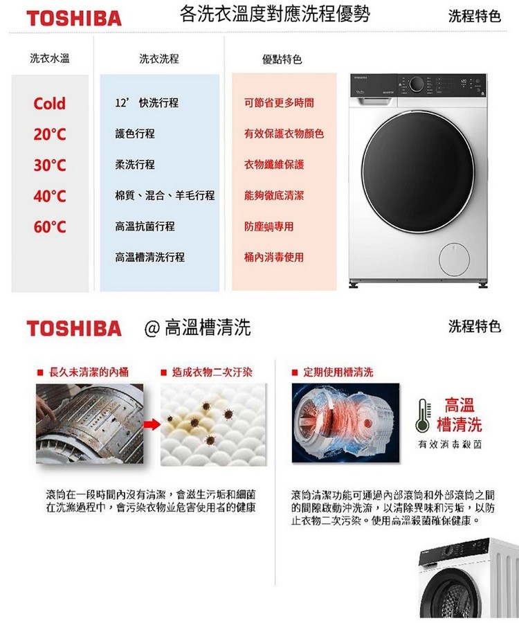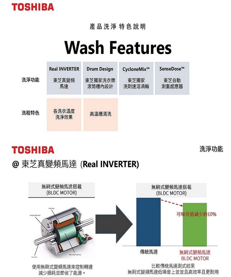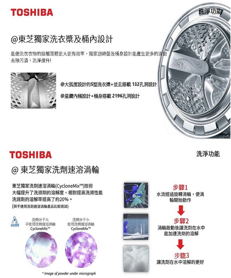 ◆洗淨機能 : TOSHIBA獨家Great Waves強力高效沖浪洗淨技術,冷水即可去汙達溫水洗淨能力保護衣物,省電節能/TOSHIBA獨家S型洗衣槳及星鑽內桶設計/國際羊毛局標籤認證。