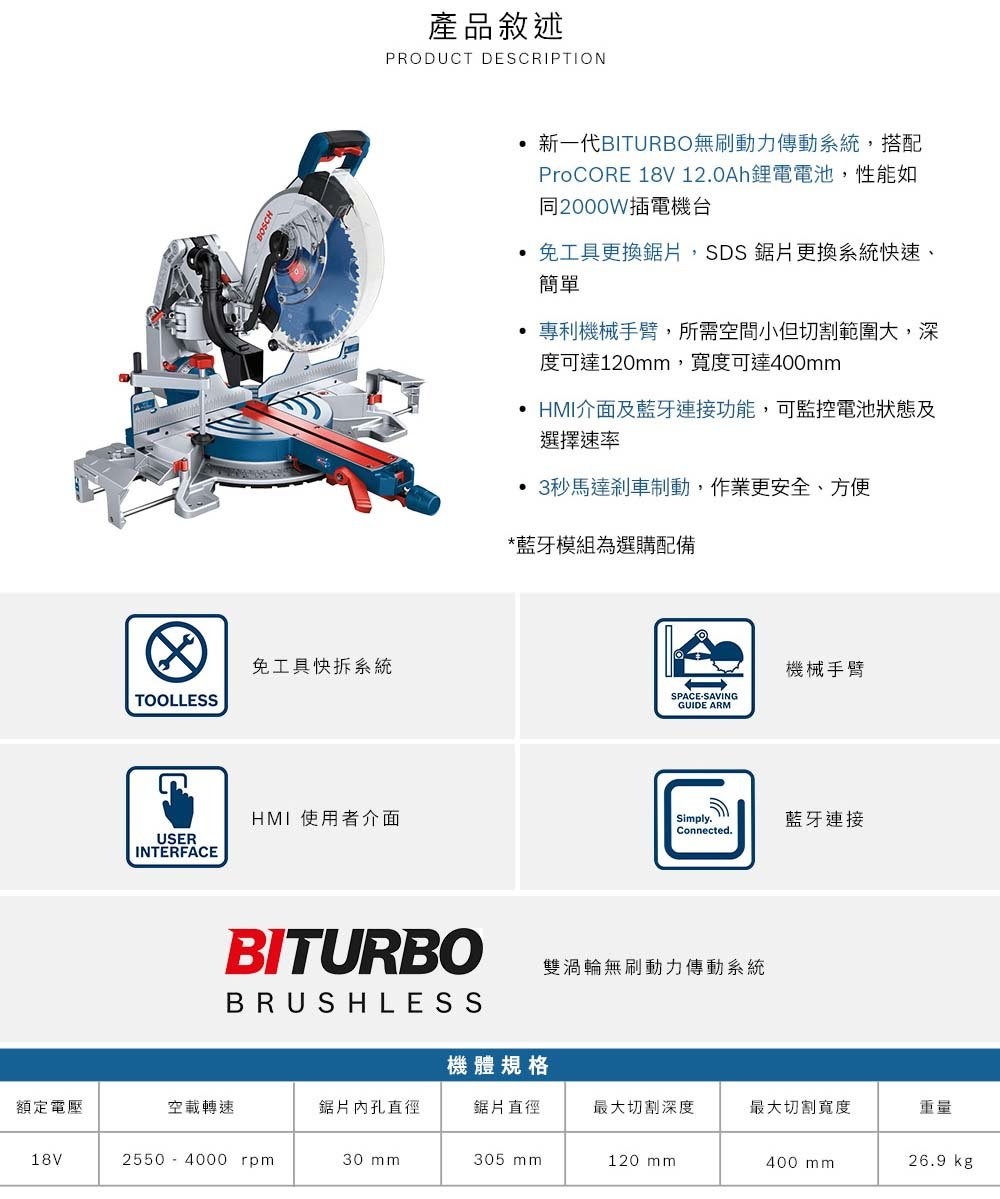 BOSCH博世 18V鋰電無刷12吋木工切斷機(空機)