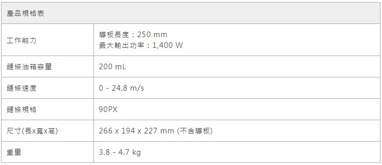 附件:主機*1、4.0A*2、充電器*1、導板*1、安全蓋*1、鍊條油(100ML)*1、扳手*1、鍊條*1、磨刀規*1、護目鏡*1