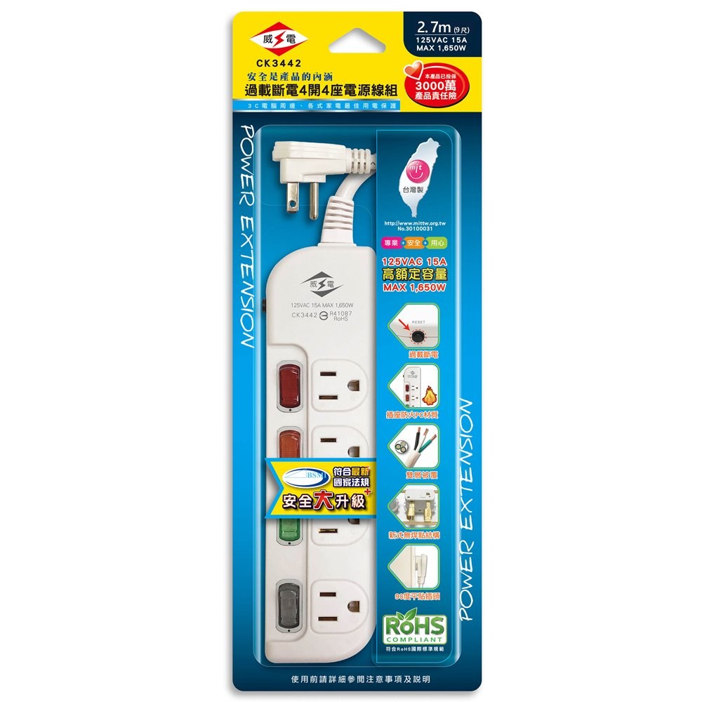 威電牌過載斷電延長線/CK3141/3孔4座1切/9尺/條