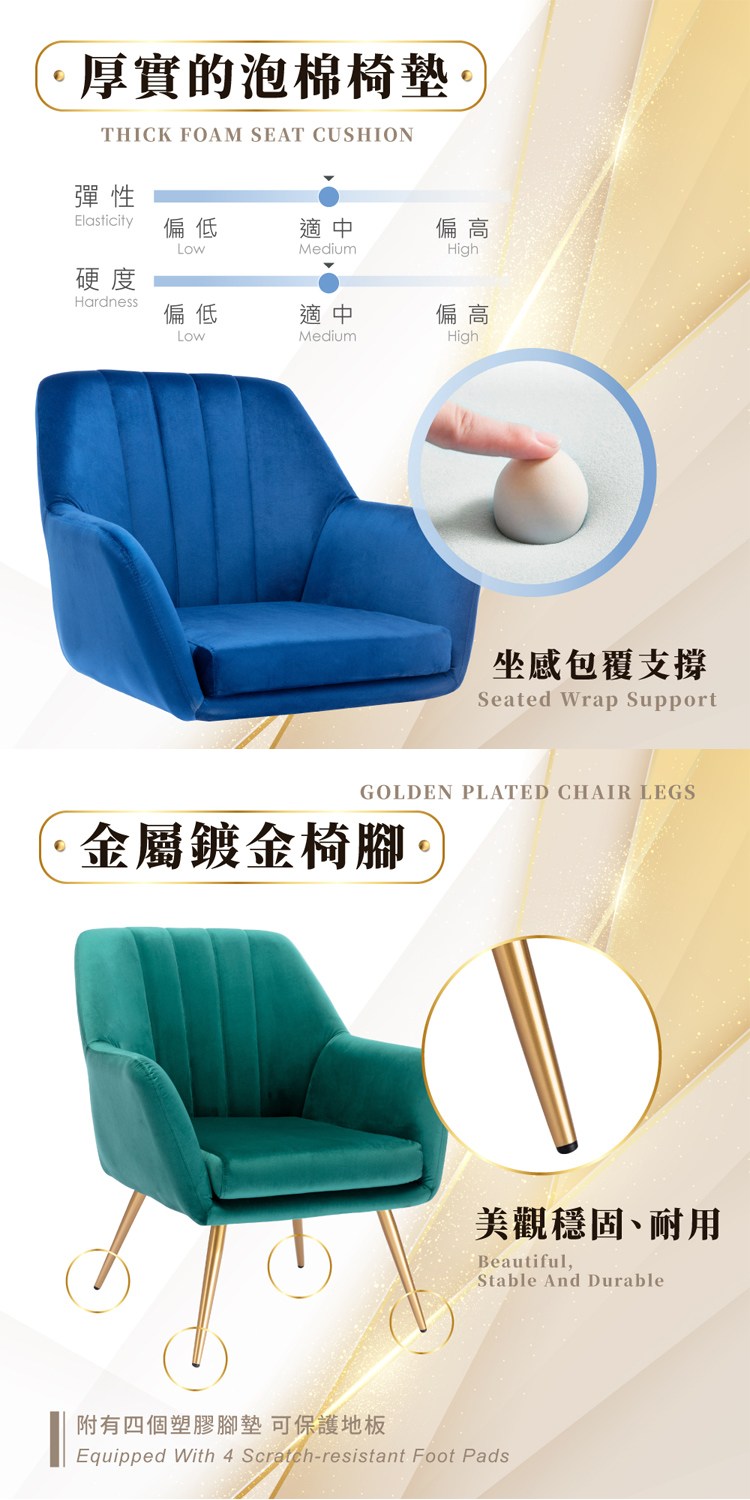 厚實的泡棉椅墊,坐感包覆支撐,金屬鍍金椅腳,美觀穩固又耐用,附有四個塑膠腳墊,可保護地板,
