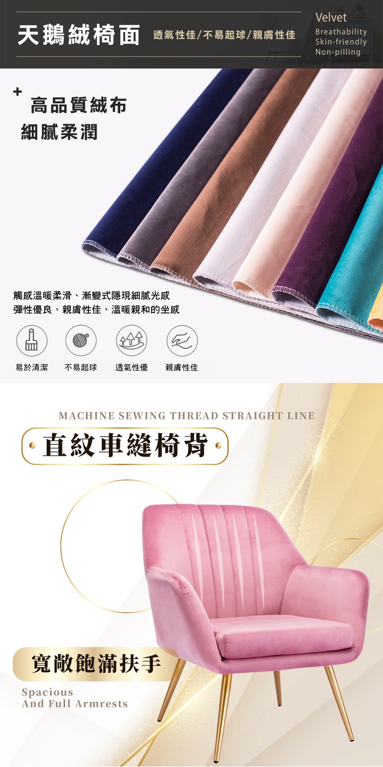 材質:絨布 + 泡棉 + 金屬鍍金椅腳