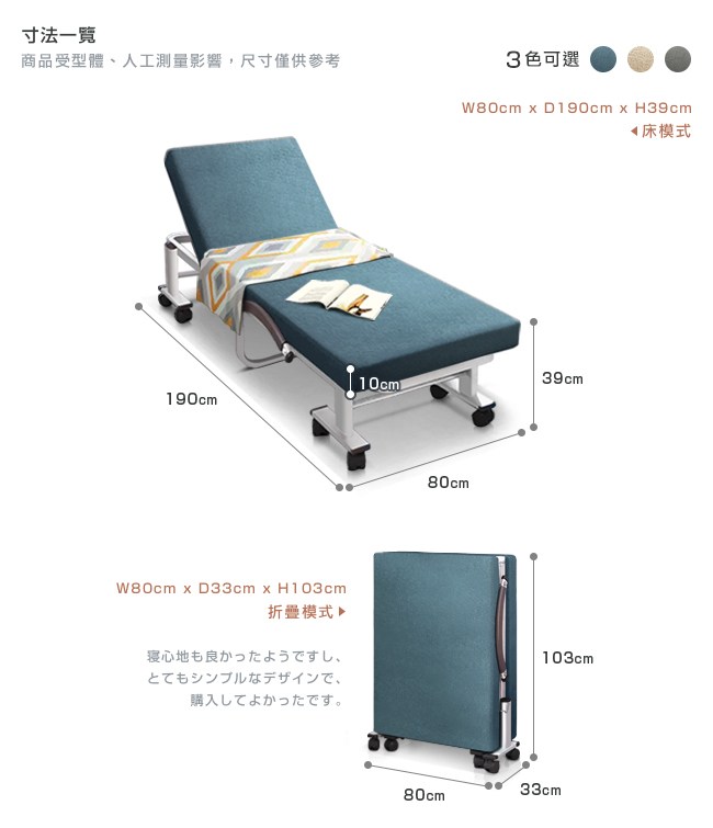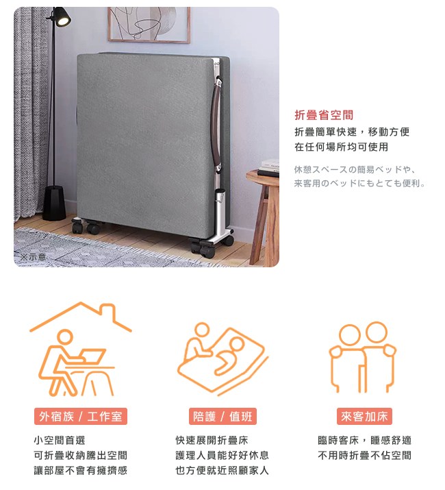 外宿族/工作室首選,可折疊收納騰出空間,讓部屋不會有擁擠感。推薦陪護/值班使用,快速展開折疊床,護理人員能好好休息,也方便就近照顧家人。有朋至遠方來,來客加床,睡感舒適,不用時折疊起來不佔用空間。
