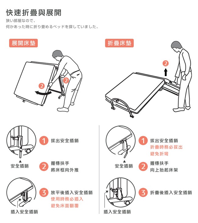 ・操作折疊與展開床面時,請務必小心謹慎