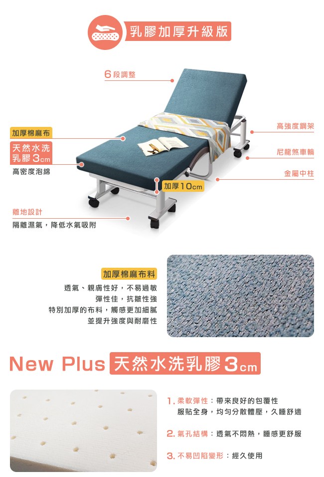 New Plus 加厚升級:天然水洗乳膠 3cm,柔軟彈性帶來良好的包覆性,服貼全身,均勻分散體壓,久睡舒適。氣孔結構,透氣不悶熱,睡感更舒服。不易凹陷變形,經久使用。加厚棉麻布,透氣、親膚性好,不易過敏。特別加厚的布料,觸感更加細膩,並提升強度與耐磨性。六段椅背快速調整,握住床墊背部,向上扳即可選擇椅背傾仰度。椅背扳過 90 度後,自然回檔放平,簡單變成一張床舖。安全插銷與防夾手設計,在折疊與展開床面時,操作過程更加安全。折疊後寬幅 33cm,方便移動,不佔地方,可收納於隙縫角落。橫向粗管床架、加密鋼網、加厚鍍鋅管,承重強,結構安穩,經久耐用。可拆洗布套,定期清潔床套,避免過敏原孳生。贈送小方枕 1 個(顏色隨機)與防塵套 1 個,折疊後可避免床墊沾染灰塵,保持乾淨。