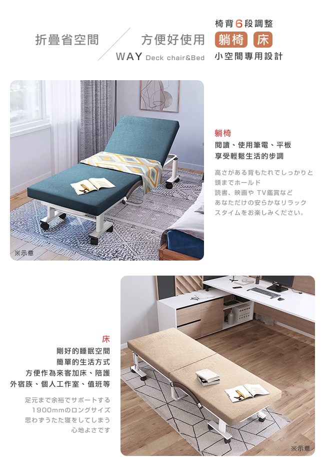 外宿族/工作室首選,可折疊收納騰出空間,讓部屋不會有擁擠感。推薦陪護/值班使用,快速展開折疊床,護理人員能好好休息,也方便就近照顧家人。有朋至遠方來,來客加床,睡感舒適,不用時折疊起來不佔用空間。