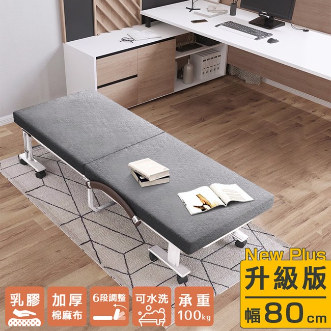 New Plus 加厚升級:天然水洗乳膠 3cm,柔軟彈性帶來良好的包覆性,服貼全身,均勻分散體壓,久睡舒適。氣孔結構,透氣不悶熱,睡感更舒服。不易凹陷變形,經久使用。加厚棉麻布,透氣、親膚性好,不易過敏。特別加厚的布料,觸感更加細膩,並提升強度與耐磨性。六段椅背快速調整,握住床墊背部,向上扳即可選擇椅背傾仰度。椅背扳過 90 度後,自然回檔放平,簡單變成一張床舖。安全插銷與防夾手設計,在折疊與展開床面時,操作過程更加安全。折疊後寬幅 33cm,方便移動,不佔地方,可收納於隙縫角落。橫向粗管床架、加密鋼網、加厚鍍鋅管,承重強,結構安穩,經久耐用。可拆洗布套,定期清潔床套,避免過敏原孳生。贈送小方枕 1 個(顏色隨機)與防塵套 1 個,折疊後可避免床墊沾染灰塵,保持乾淨。