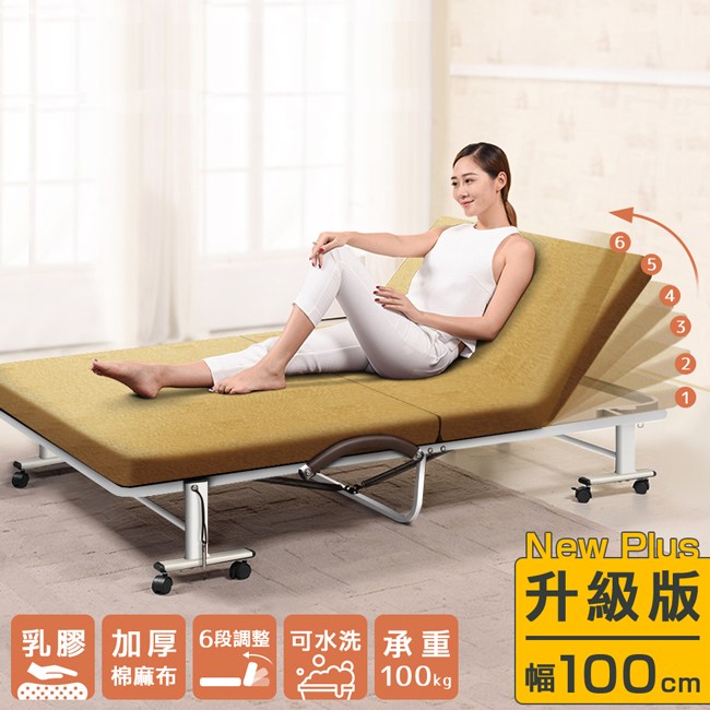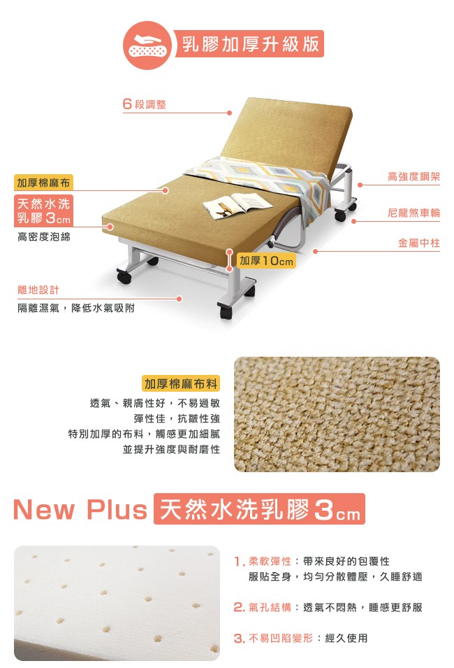 New Plus 加厚升級:天然水洗乳膠 3cm,柔軟彈性帶來良好的包覆性,服貼全身,均勻分散體壓,久睡舒適。氣孔結構,透氣不悶熱,睡感更舒服。不易凹陷變形,經久使用。加厚棉麻布,透氣、親膚性好,不易過敏。特別加厚的布料,觸感更加細膩,並提升強度與耐磨性。六段椅背快速調整,握住床墊背部,向上扳即可選擇椅背傾仰度。椅背扳過 90 度後,自然回檔放平,簡單變成一張床舖。安全插銷與防夾手設計,在折疊與展開床面時,操作過程更加安全。折疊後寬幅 33cm,方便移動,不佔地方,可收納於隙縫角落。橫向粗管床架、加密鋼網、加厚鍍鋅管,承重強,結構安穩,經久耐用。可拆洗布套,定期清潔床套,避免過敏原孳生。贈送小方枕 1 個(顏色隨機)與防塵套 1 個,折疊後可避免床墊沾染灰塵,保持乾淨。