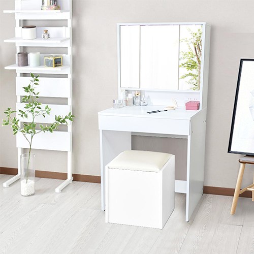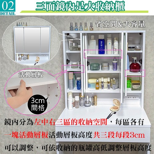 桌面下附有大收納抽屜,而三面鏡子的內部則是超實用的收納櫃,每面鏡子後面都各有一個收納空間,其中各有一塊活動式層板,讓您各種高度的化妝瓶罐都可以收藏在內,讓忍不住衝動時常購買瓶瓶罐罐或雜物的您,有充分的空間,超大的收納設計市面上絕無僅有。