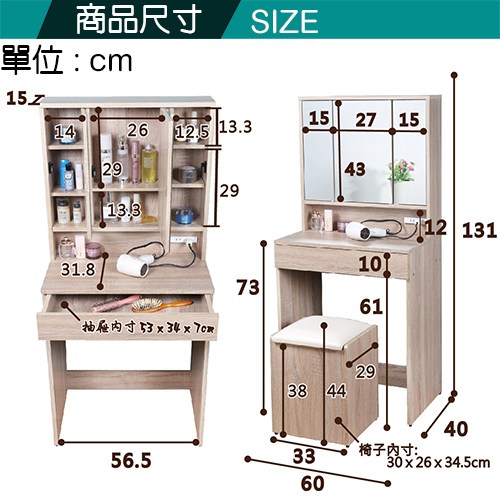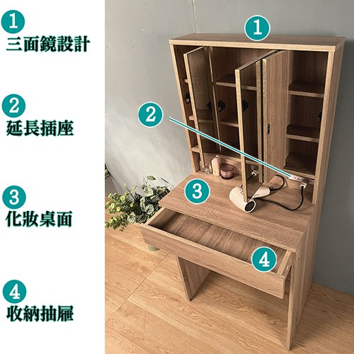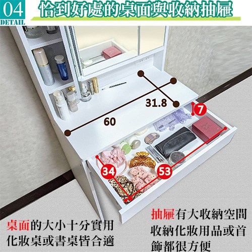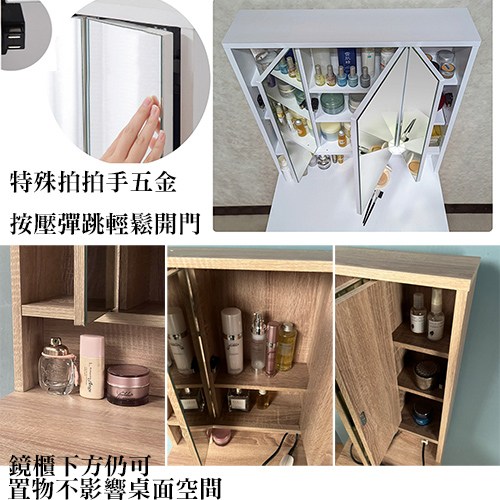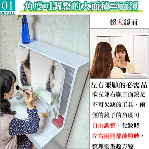 桌面下附有大收納抽屜,而三面鏡子的內部則是超實用的收納櫃,每面鏡子後面都各有一個收納空間,其中各有一塊活動式層板,讓您各種高度的化妝瓶罐都可以收藏在內,讓忍不住衝動時常購買瓶瓶罐罐或雜物的您,有充分的空間,超大的收納設計市面上絕無僅有。